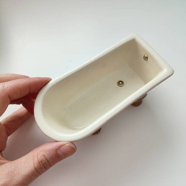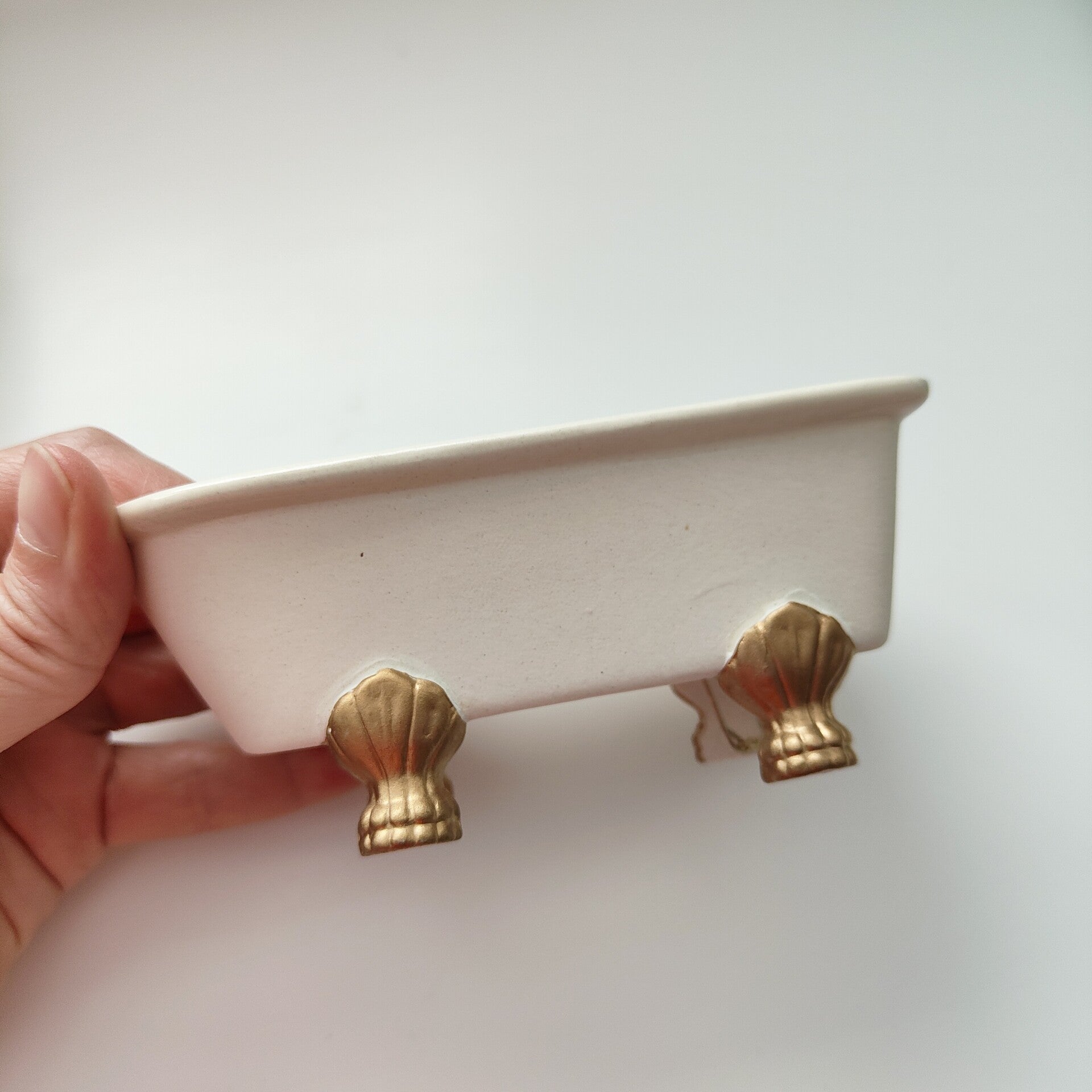 Ligbad van keramiek, in gebroken wit met goudkleurige pootjes. Er zit ook een goudkleurige stop en overloopje in.