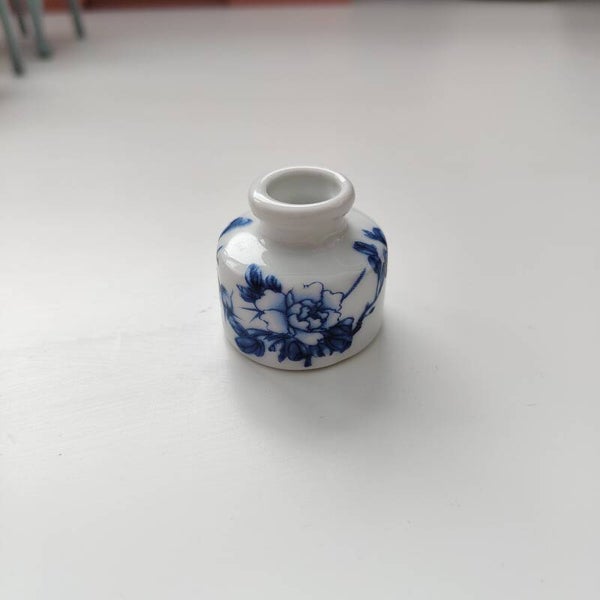 Keramiek vaasje met kobalt blauwe opdruk. Afmeting: diameter 3cm, 3cm hoogIs wat aan de grote kant voor schaal 1:12, kan wel leuk bij Maileg of Barbie