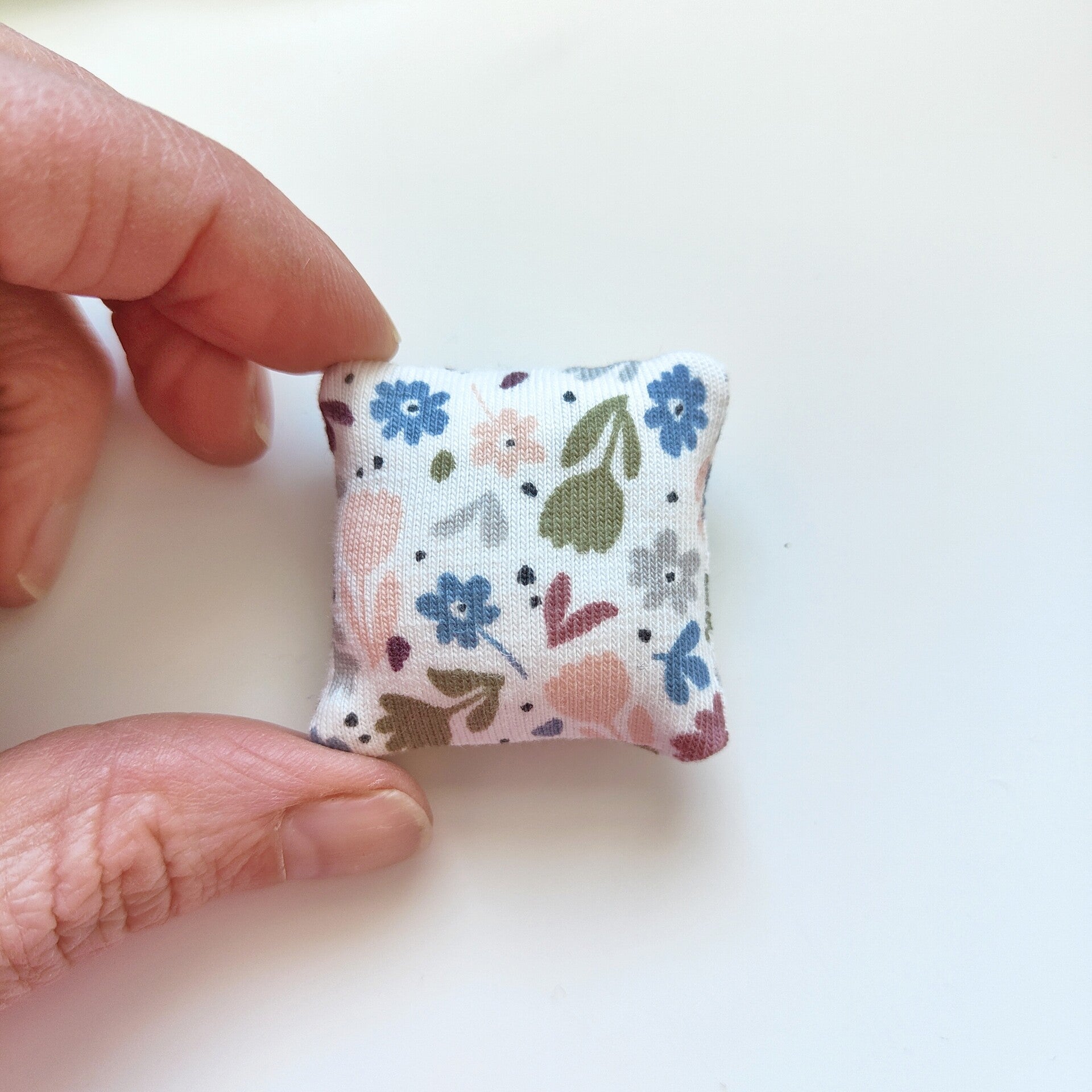 Leuk kussentje voor op de bank of op het bed van je poppenhuis, met een print van takjes en bloemen in de kleuren olijfgroen, blauw, lichtgrijs, zalm roze en donker rood.