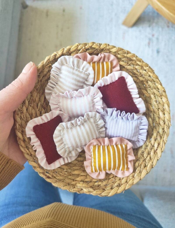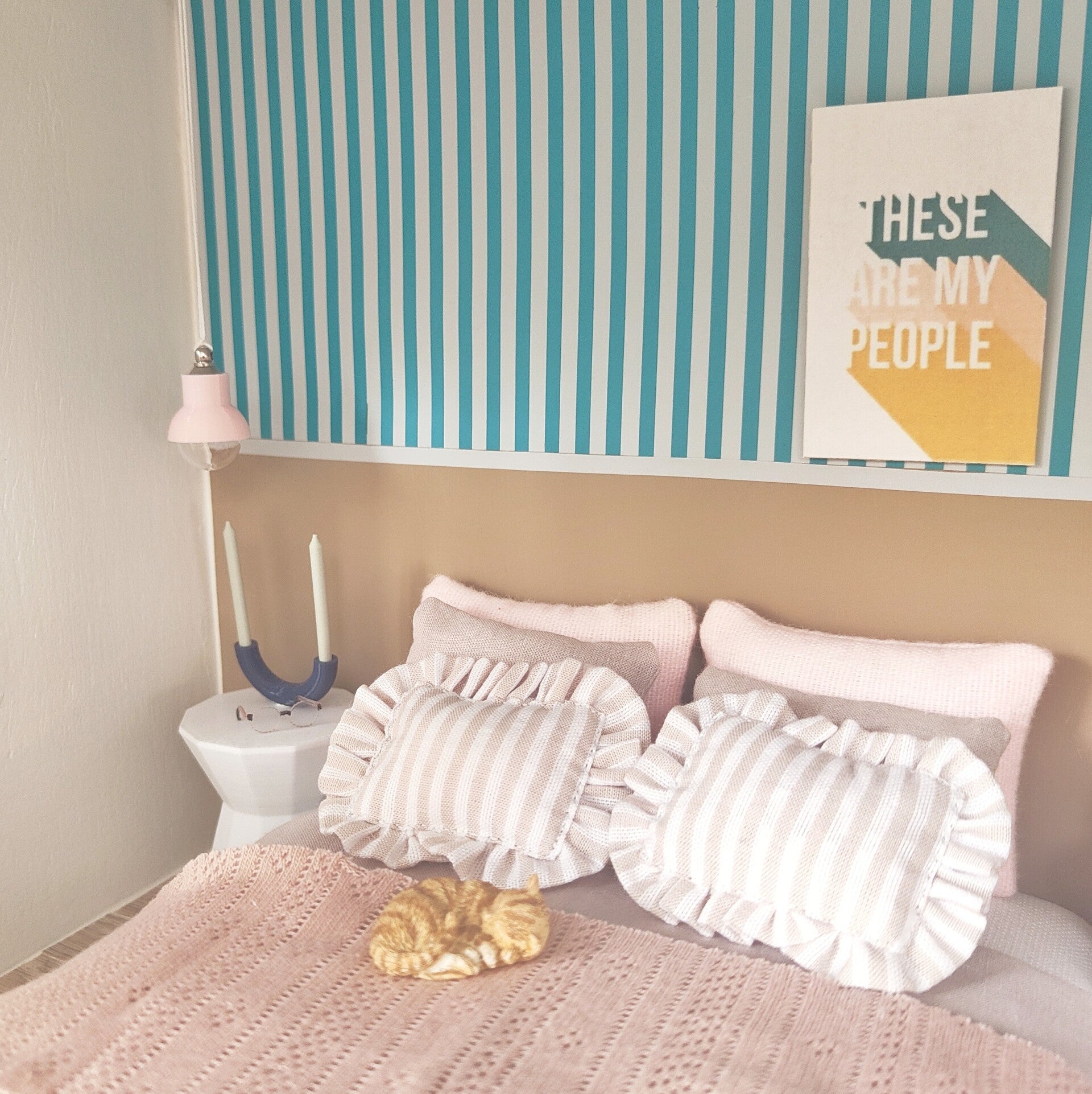 Handgemaakt kussentje met ruches voor in je poppenhuis.