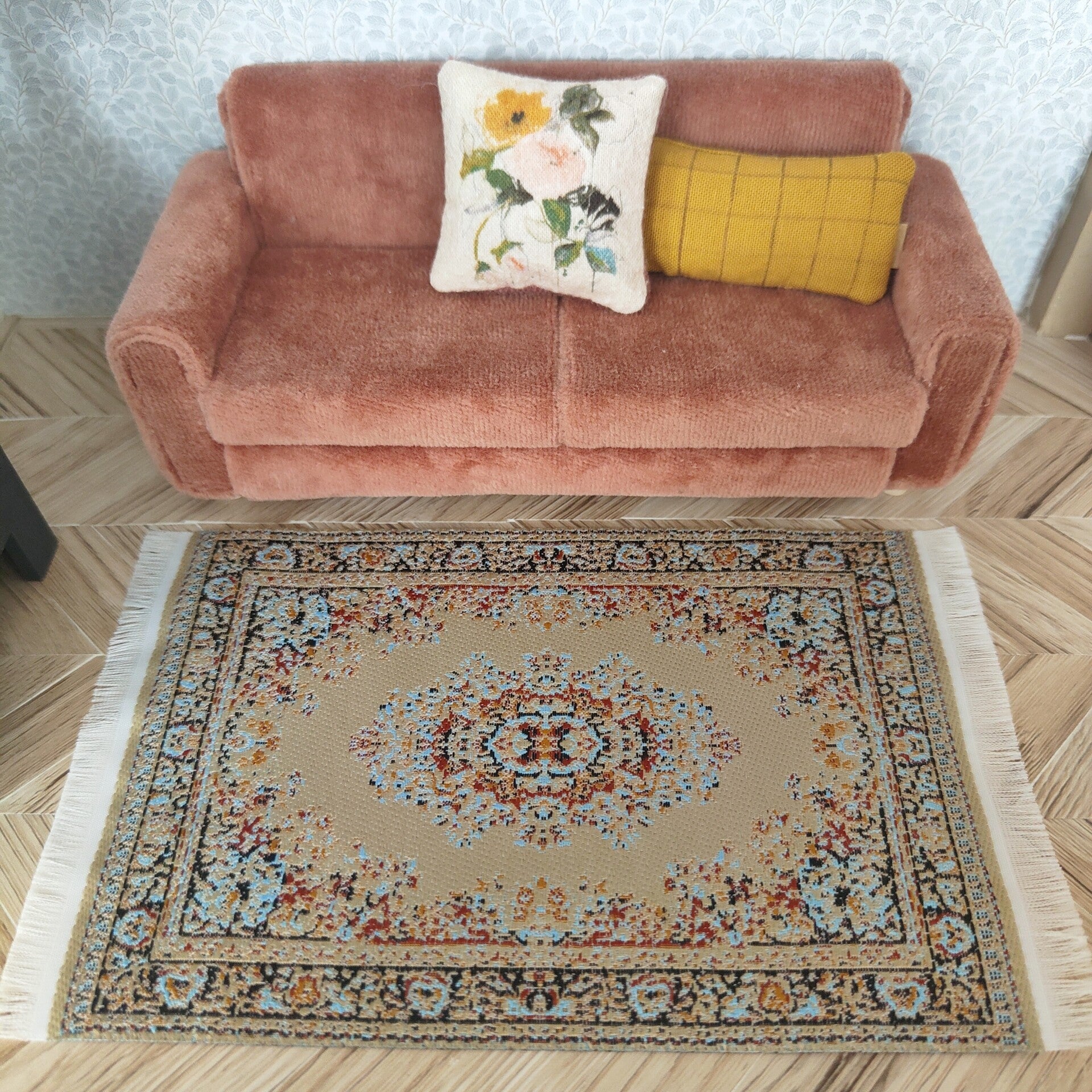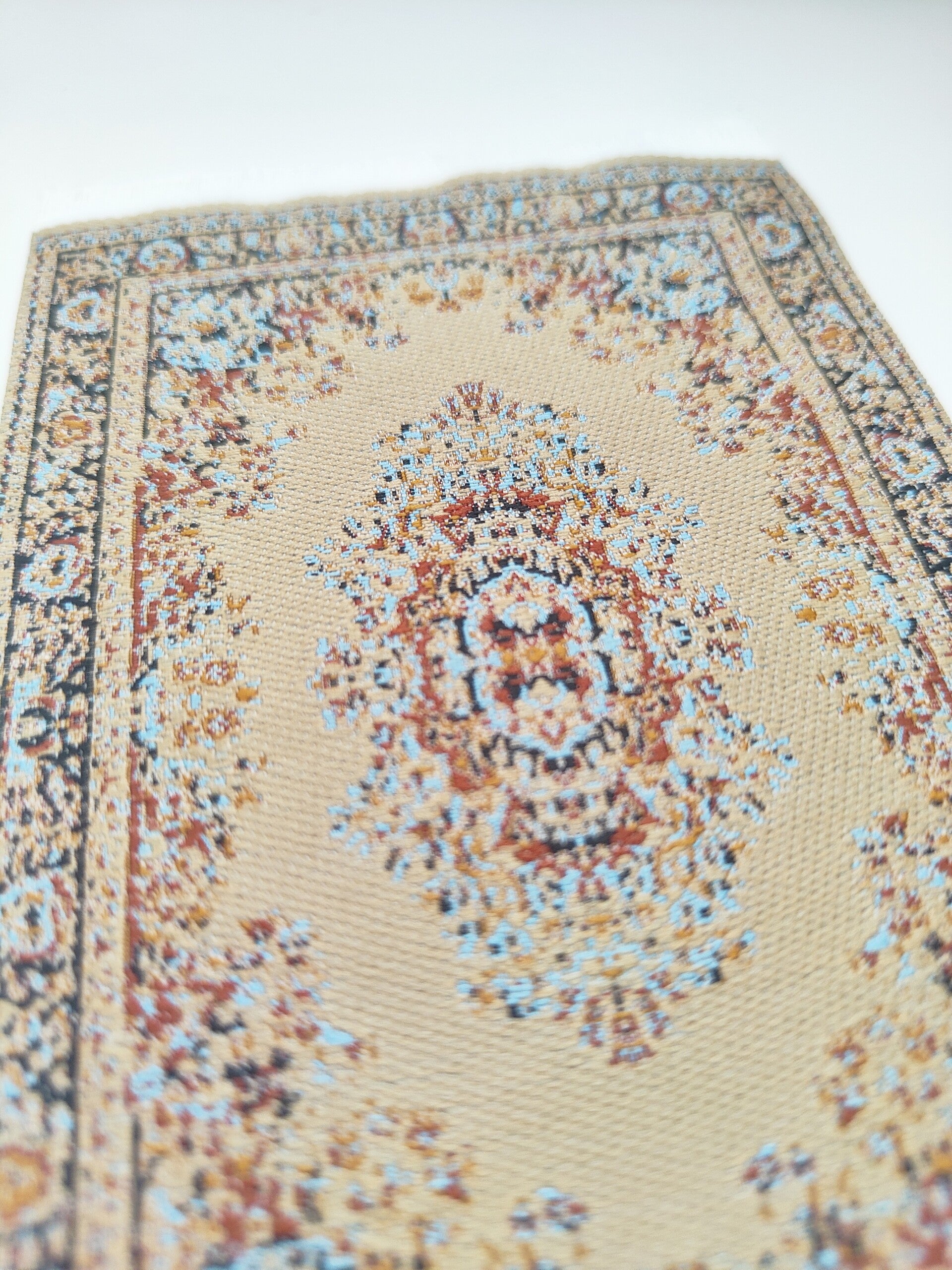 Klassiek vloerkleed voor je poppenhuis in beige, terra en blauw. Superleuk te combineren met de Maileg stijl of moderne stijl poppenhuis. Afmeting: 16,3cm lang (incl. franje) en 10cm breed