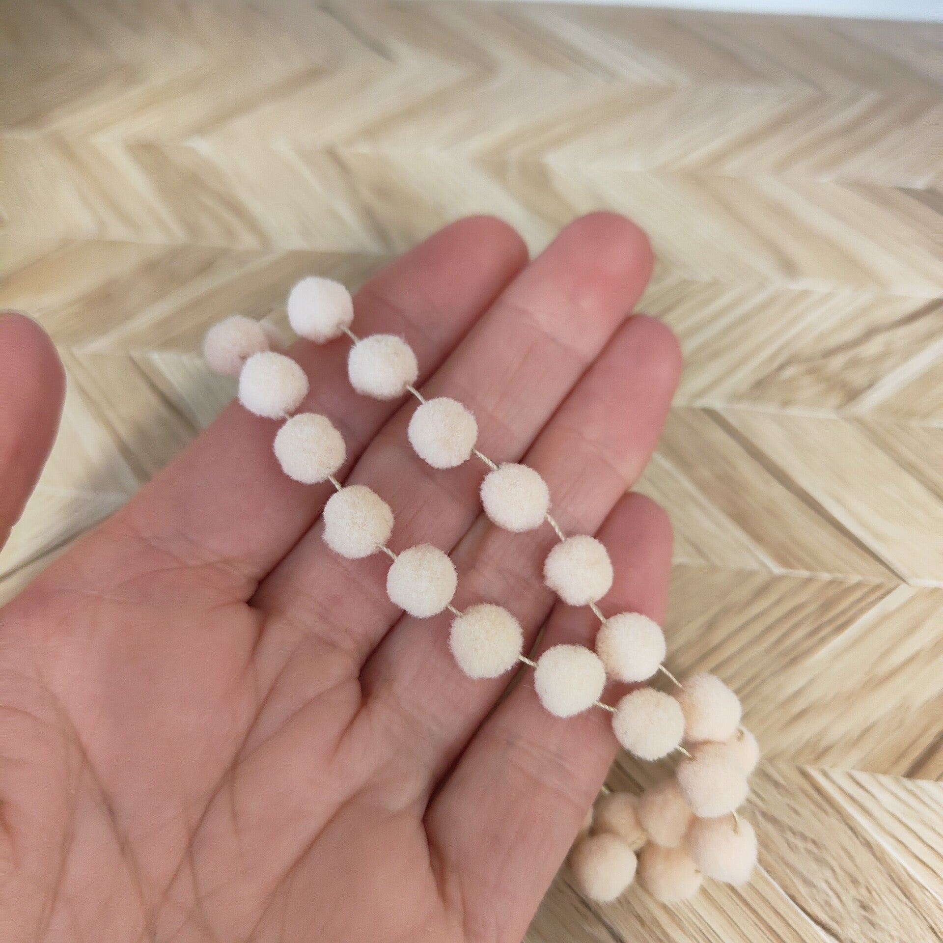 Pompom slinger van vilt bolletjes. Heel licht roze, bijna beige van kleur. 1 bolletje is 8x8mm Totale lengte slinger is 35cm