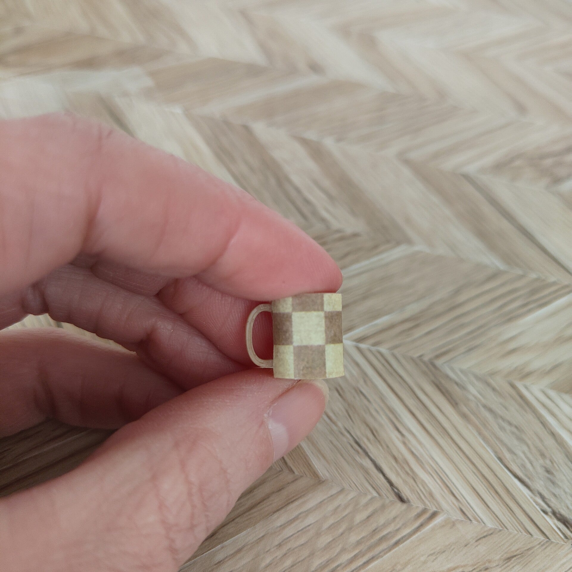 Proefmodel voor bekers (zelfde maat als in de webshop) in houtlook geprint met een beige/bruine blokjes print. Setje van 4 stuks Afmetingen beker: LxBxH 1,5 cm (incl oor) x 1cm x 1,3 cm