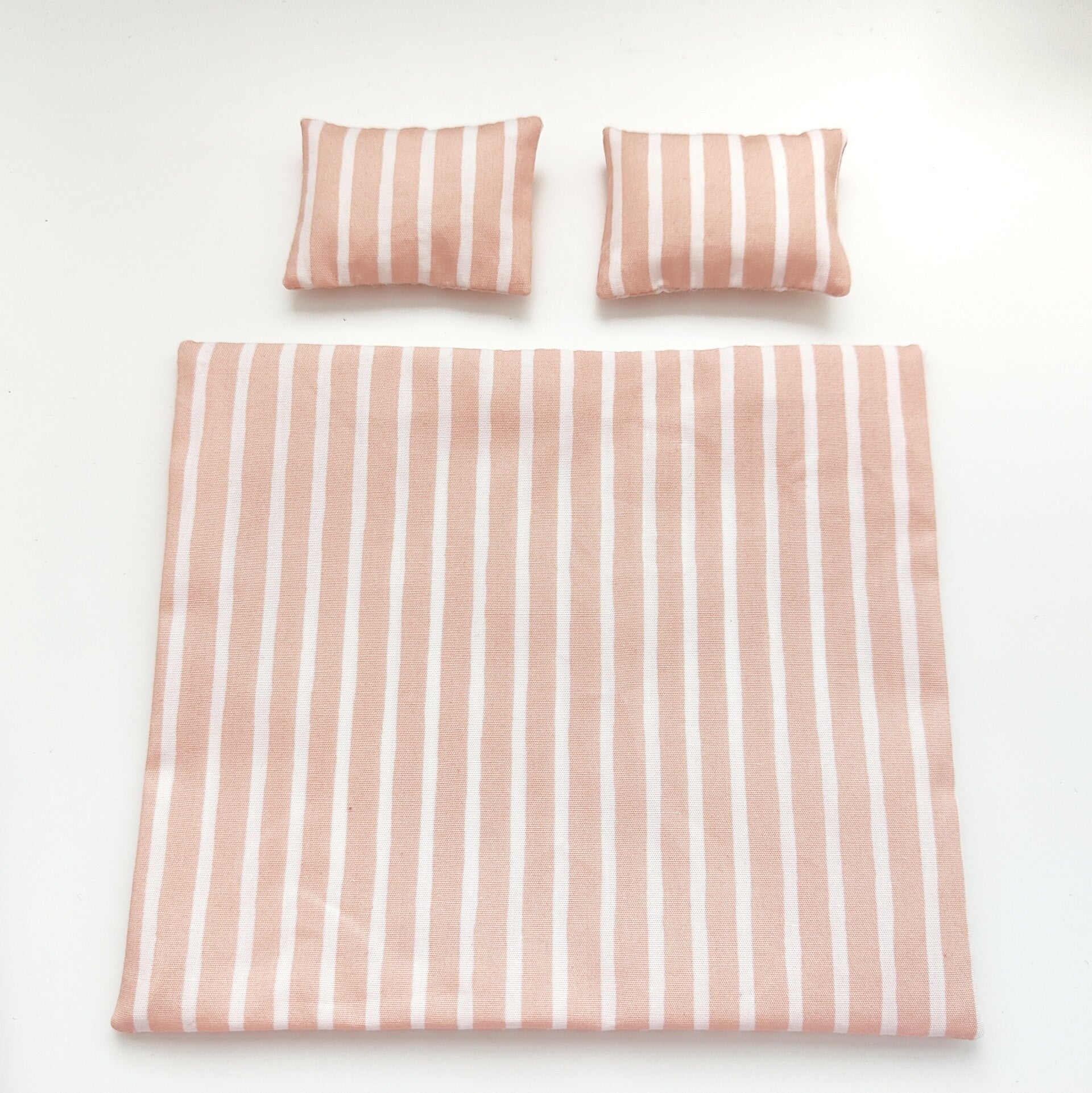 Poppenhuis beddengoed in zalm roze / wit streepjes