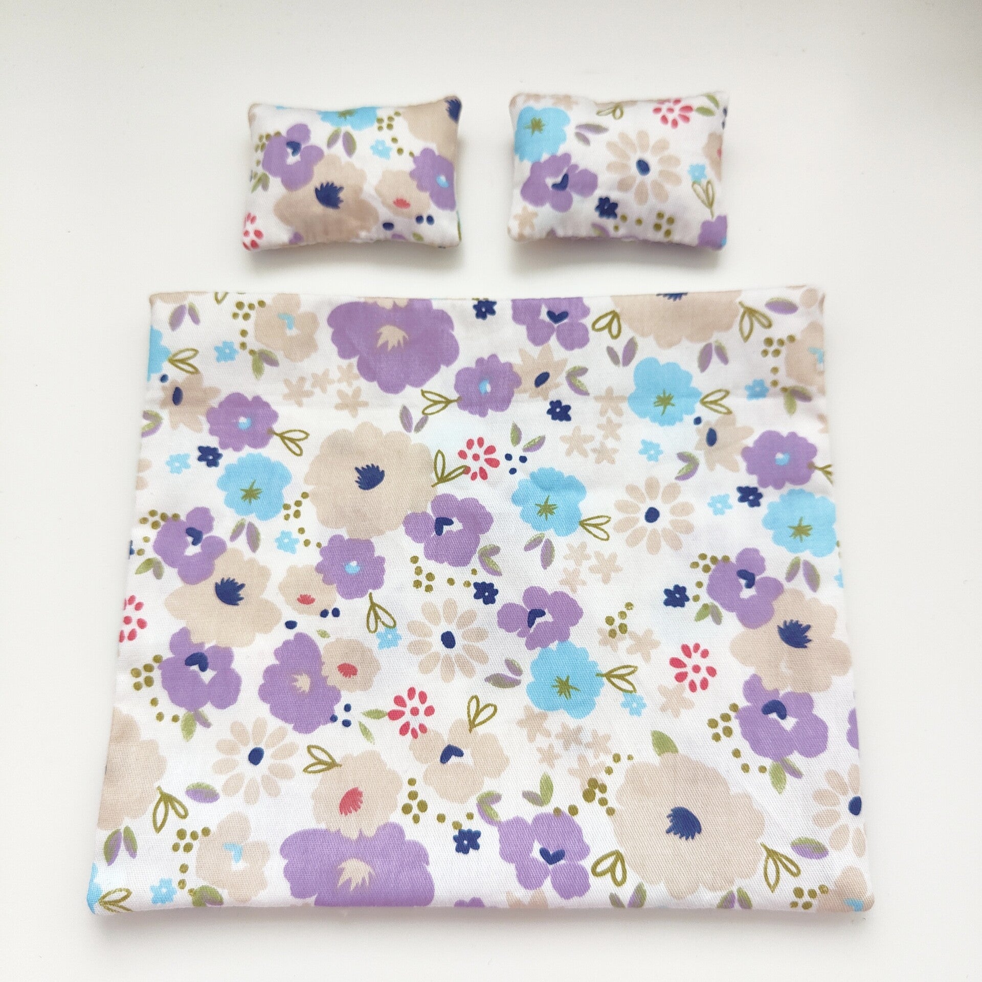Poppenhuis beddengoed in lila, beige, blauw en roze bloemen print