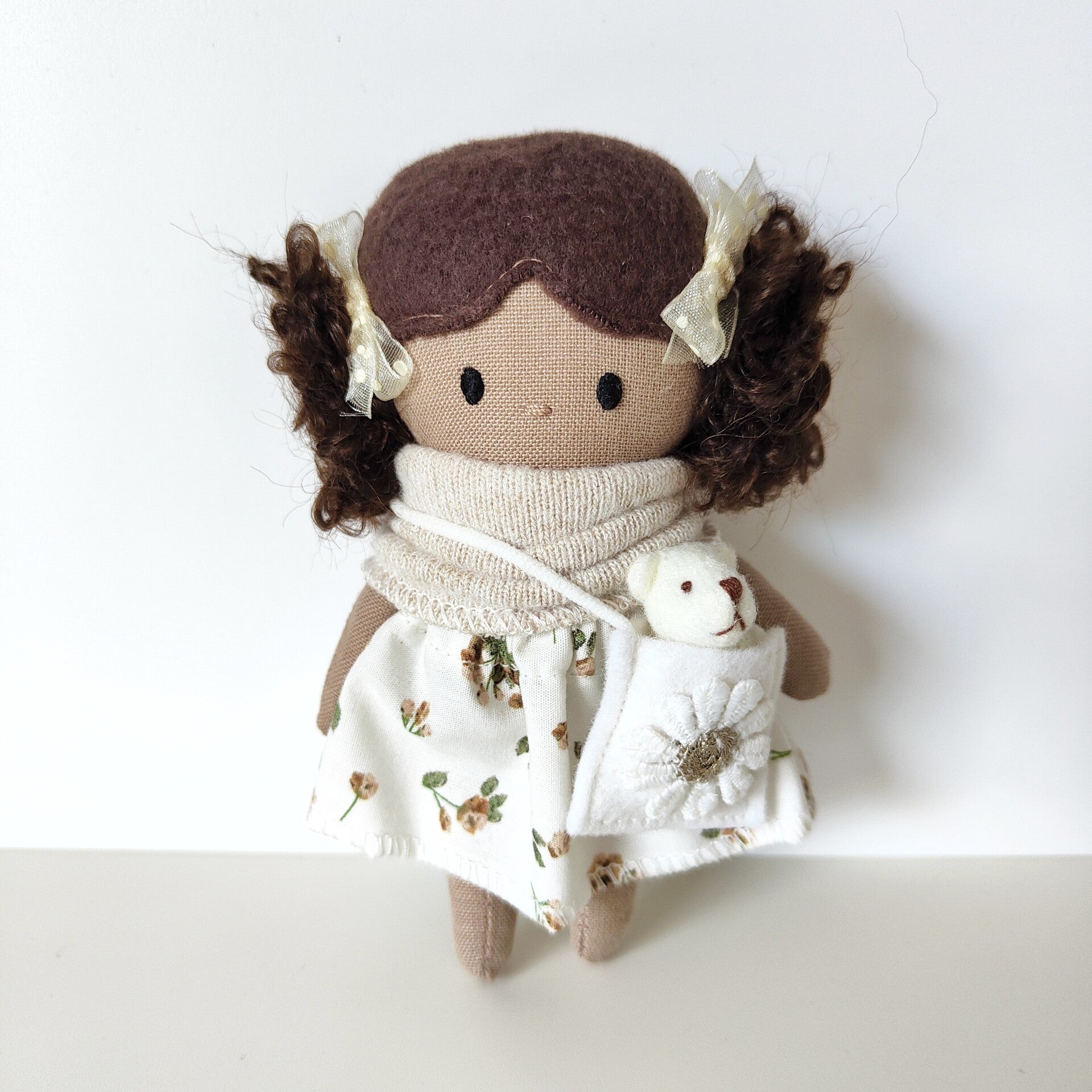 Dit lieve kleine popje is handgemaakt en ongeveer 12 cm groot. Ze heeft een lief knuffelbeertje in haar tasje.