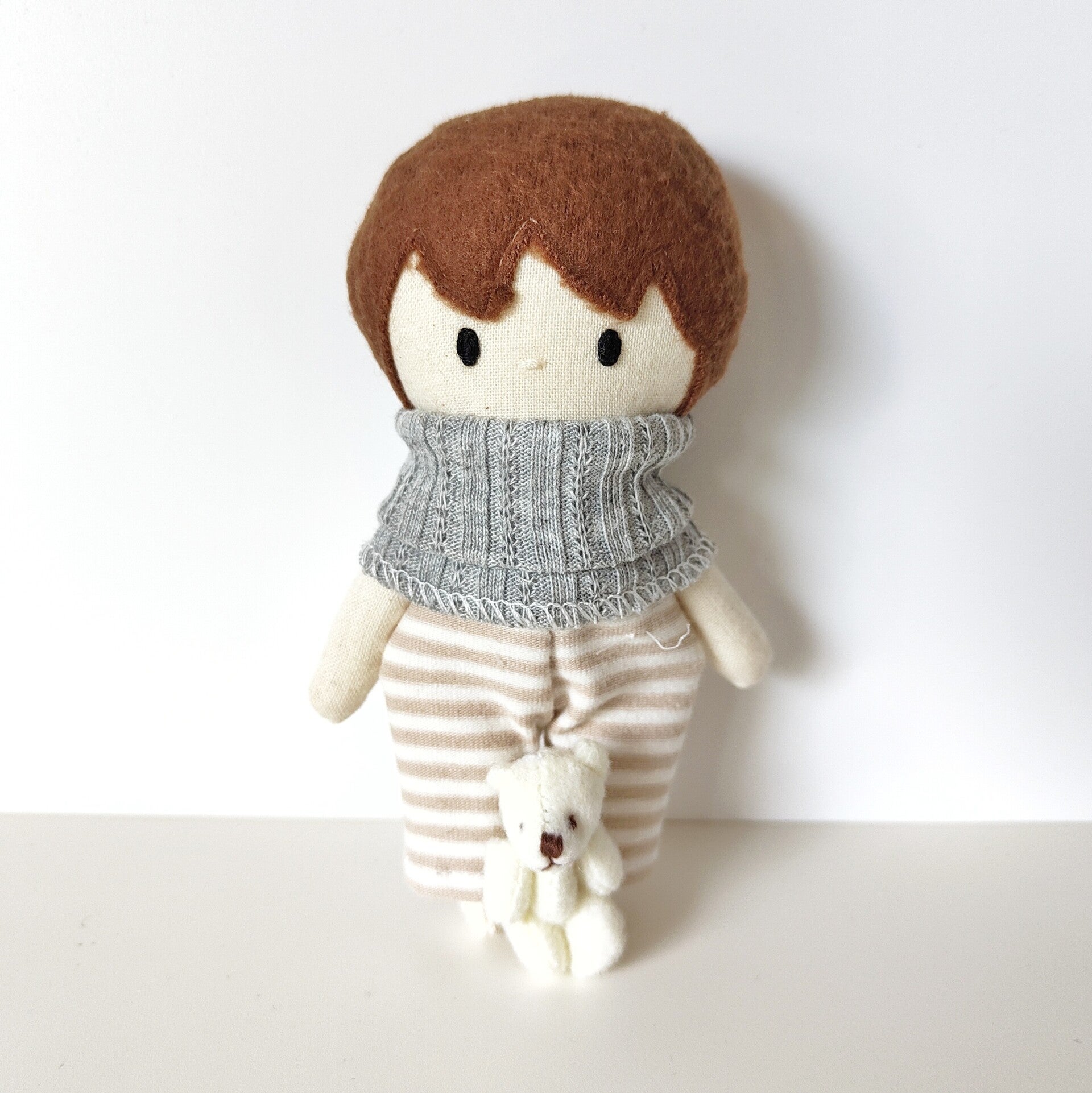 Dit stoere kleine popje is handgemaakt en ongeveer 12 cm groot. Hij heeft een lief knuffelbeertje bij zich.