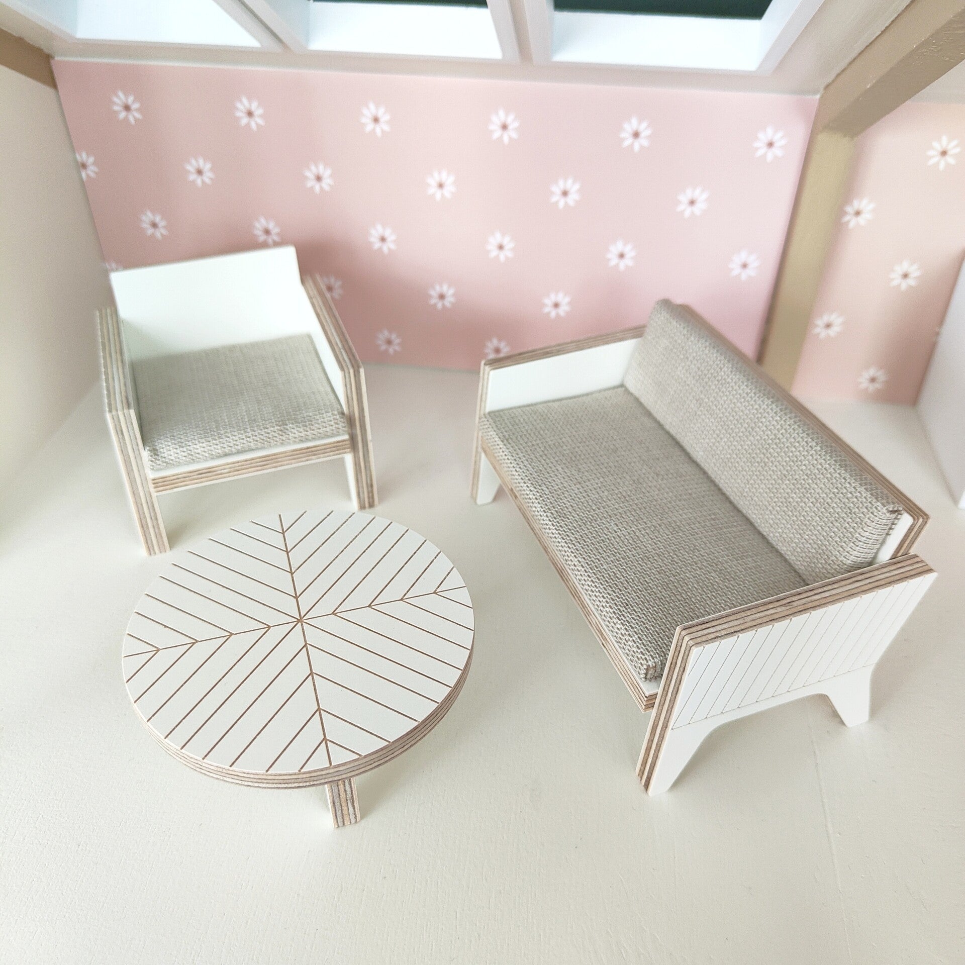 Superleuk Stoeltje voor in je poppenhuis. Het stoeltje is gemaakt van hout en heeft aan de zijkant een gravering van lijnen; een hippe moderne look.