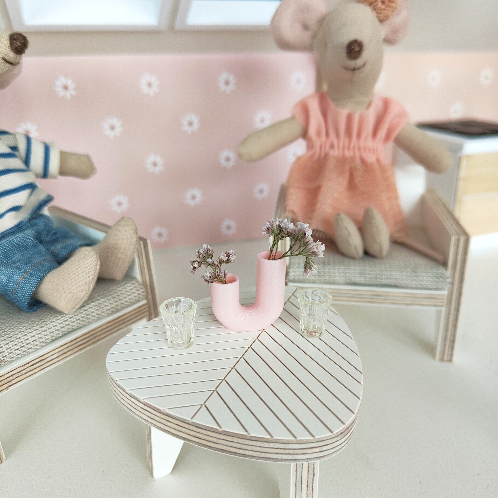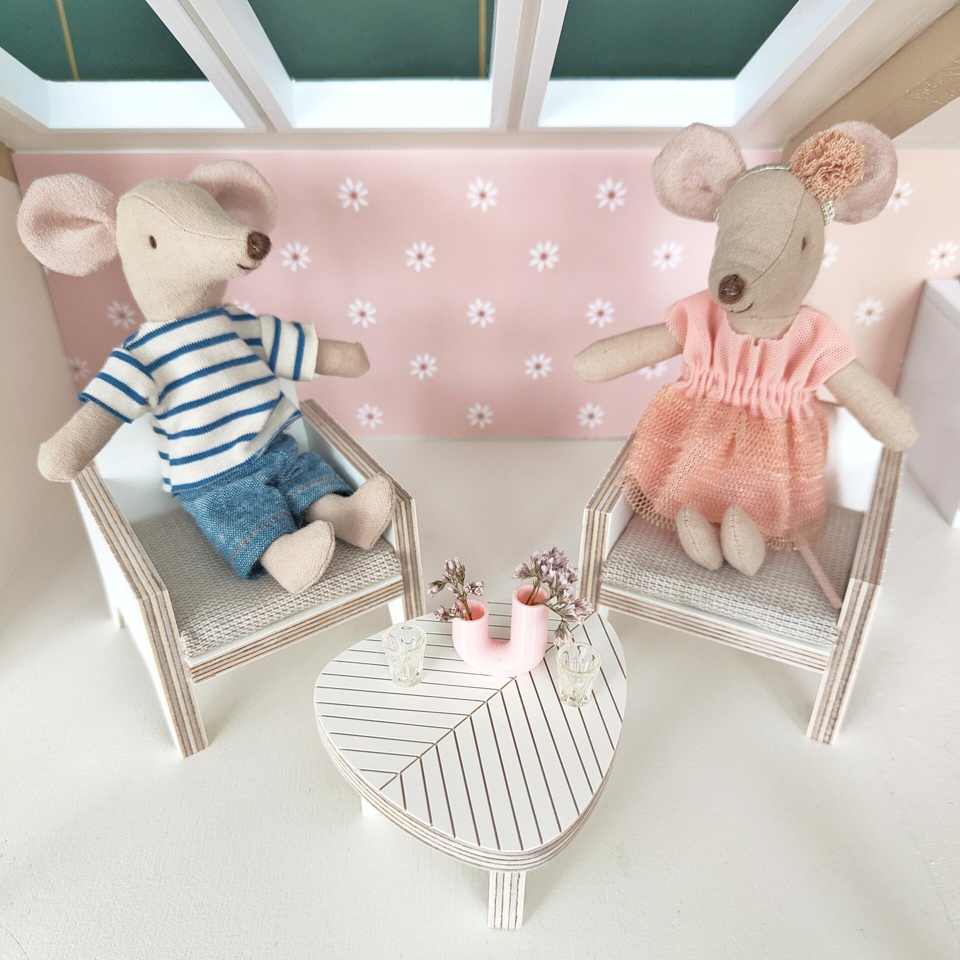 Het past prima in een 1:12 poppenhuis, de Maileg muisjes (op de foto maat grote zus/broer) en de popjes van Kleine Lievelijne passen er prima op.