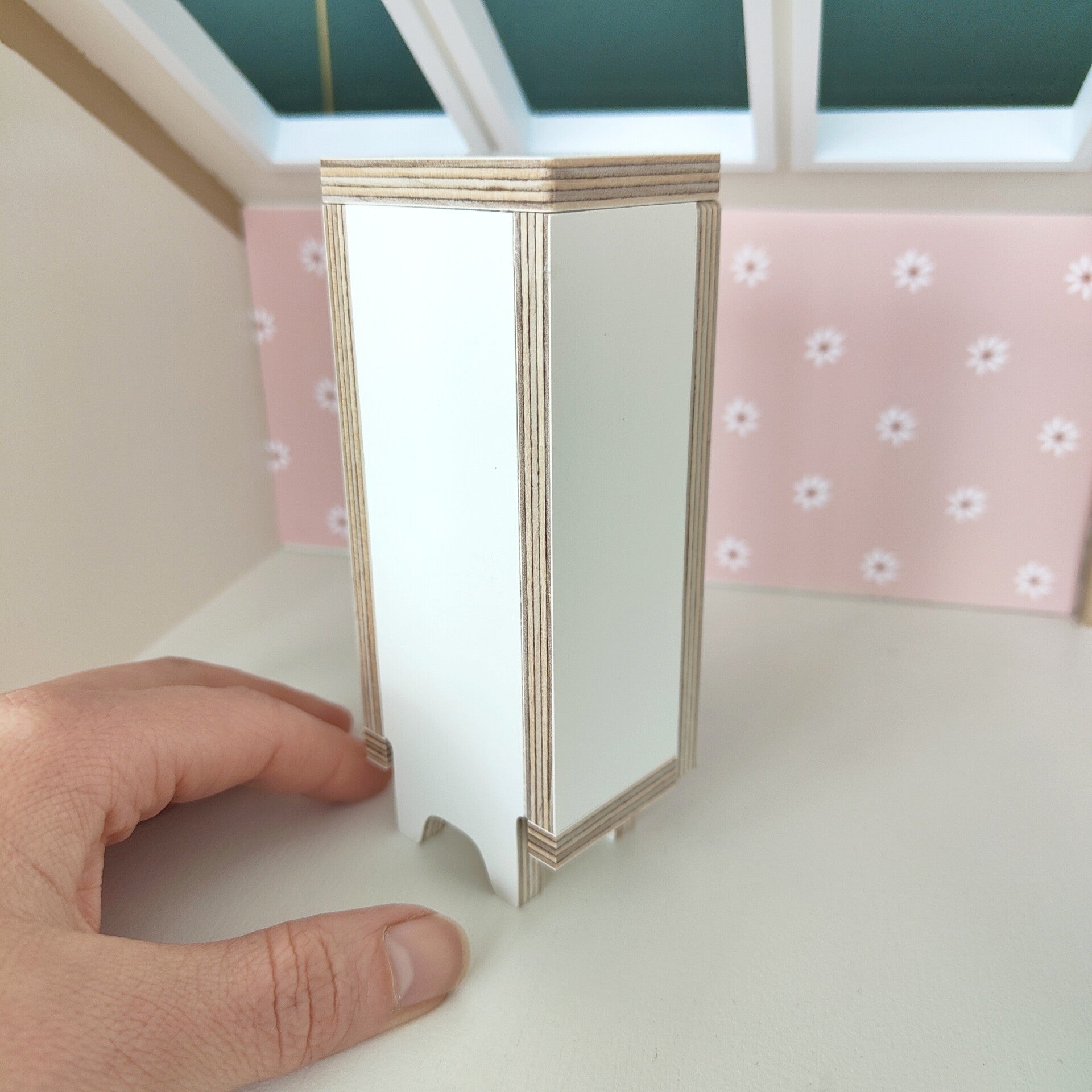 Superleuke hoge kast voor in je poppenhuis. De kast is gemaakt van hout en heeft op de deuren een gravering van Strepen; een hippe moderne look.