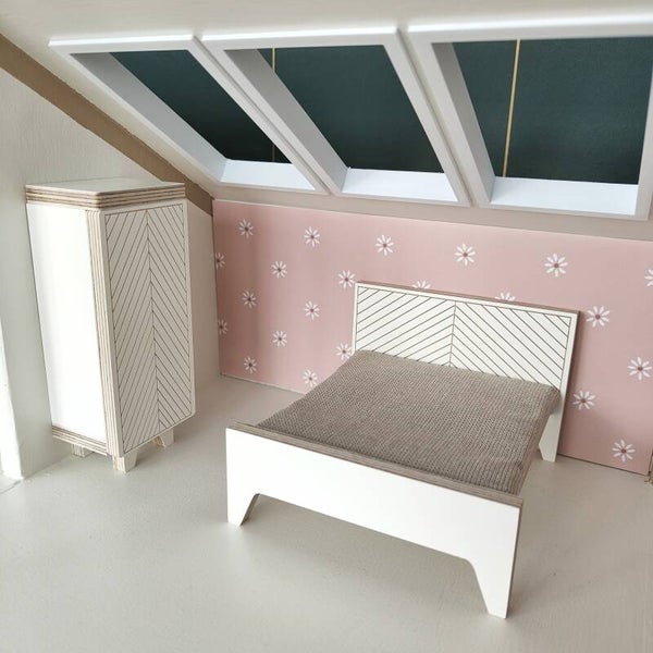 De kast past prima in een 1:12 poppenhuis. De Maileg muisjes en de popjes van Kleine Lievelijne passen er prima bij.
